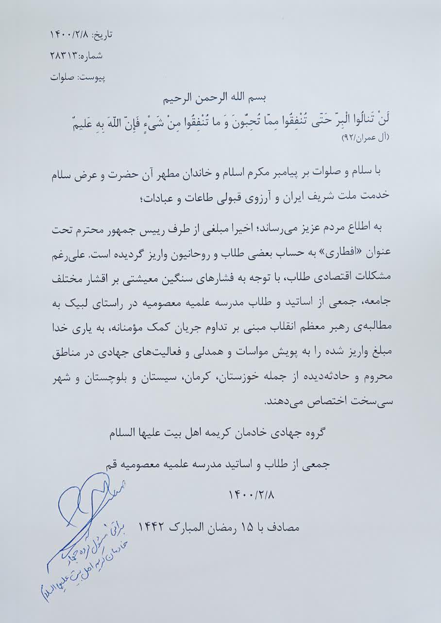 اساتید و طلاب مدرسه مبارکه معصومیه قم مبلغ افطاری رئیس جمهور را برای مواسات و فعالیت جهادی در مناطق محروم اهدا...